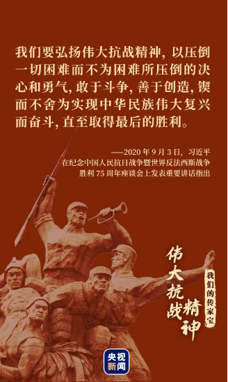 鑒往事,知來(lái)者。繼承和弘揚(yáng)偉大抗戰(zhàn)精神,以越是艱險(xiǎn)越向前的大無(wú)畏氣概,奮勇搏擊、迎難而上、勇于斗爭(zhēng),我們必將在戰(zhàn)勝各種風(fēng)險(xiǎn)挑戰(zhàn)中書寫中華民族偉大復(fù)興的新篇章。