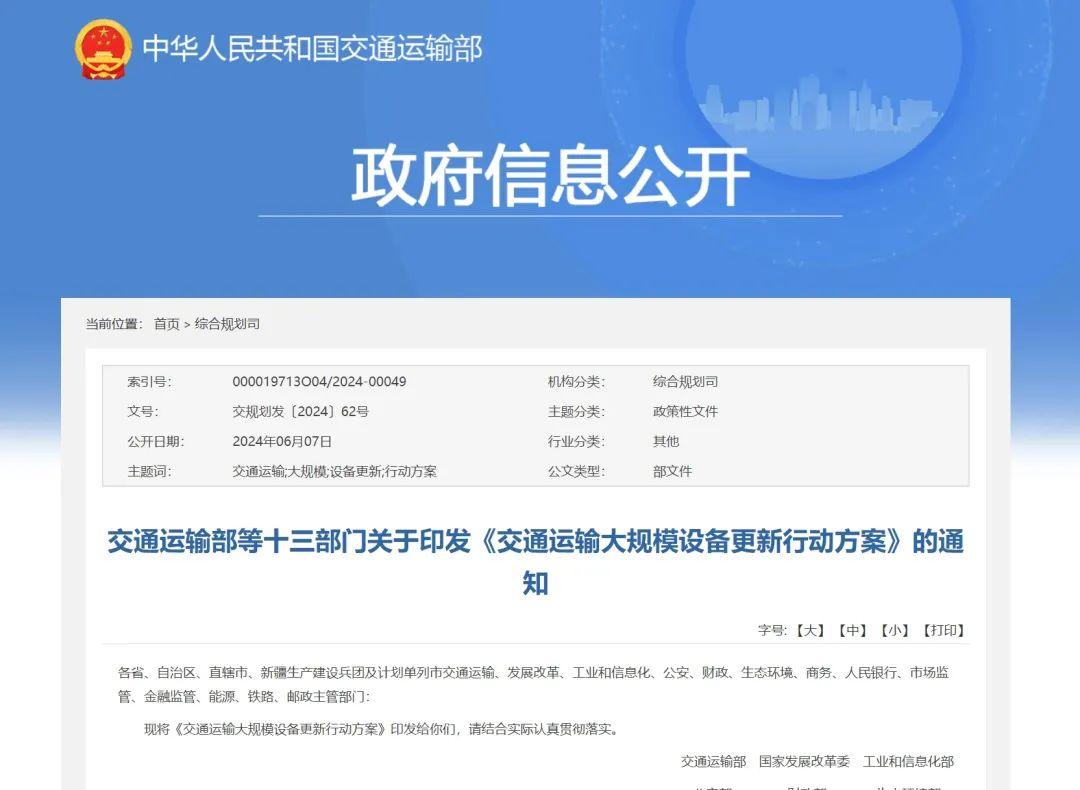 日前,交通運(yùn)輸部、國(guó)家發(fā)展改革委、工業(yè)和信息化部等十三部門(mén)聯(lián)合印發(fā)《交通運(yùn)輸大規(guī)模設(shè)備更新行動(dòng)方案》(以下簡(jiǎn)稱(chēng)《方案》),將實(shí)施城市公交車(chē)電動(dòng)化替代、老舊營(yíng)運(yùn)柴油貨車(chē)淘汰更新、老舊營(yíng)運(yùn)船舶報(bào)廢更新、老舊機(jī)車(chē)淘汰更新、郵政快遞老舊設(shè)備替代、物流設(shè)施設(shè)備更新改造、標(biāo)準(zhǔn)提升七大行動(dòng),大力促進(jìn)先進(jìn)設(shè)備和北斗終端應(yīng)用,促進(jìn)交通能源動(dòng)力系統(tǒng)清潔化、低碳化、高效化發(fā)展,有序推進(jìn)行業(yè)綠色低碳轉(zhuǎn)型。